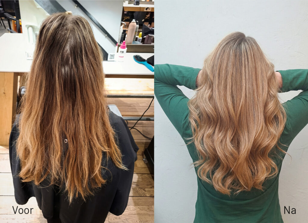 - Kleurbehandeling: De stylist voert de gewenste kleurbehandeling uit. Of dat nu een subtiele tint, balayage, highlights of full blonde is.